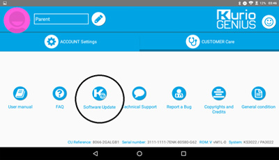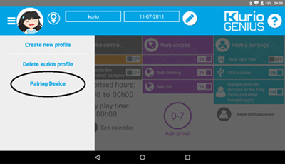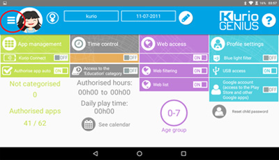Vanhempien tili asetetaan tabletin asennuksen aikana. Sen jälkeen voit silti muuttaa tai päivittää vanhempien profiilin tietoja. Valitse Kurio Genius, paina painiketta vasemmasta yläreunasta ja valitse ”vanhempien tili”: voit muuttaa sähköpostiosoitteen, nimen ja salasanan.