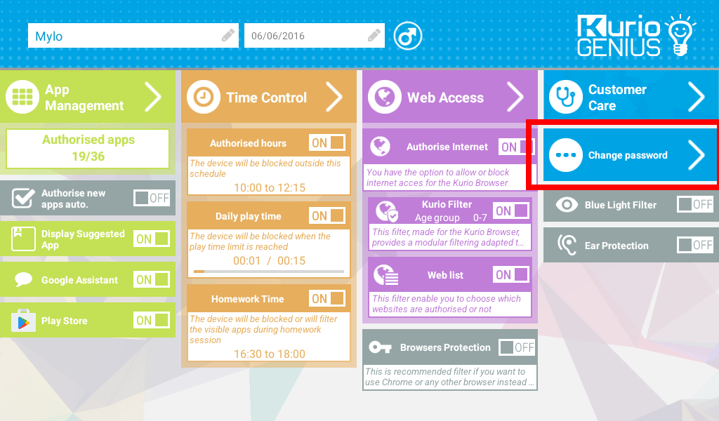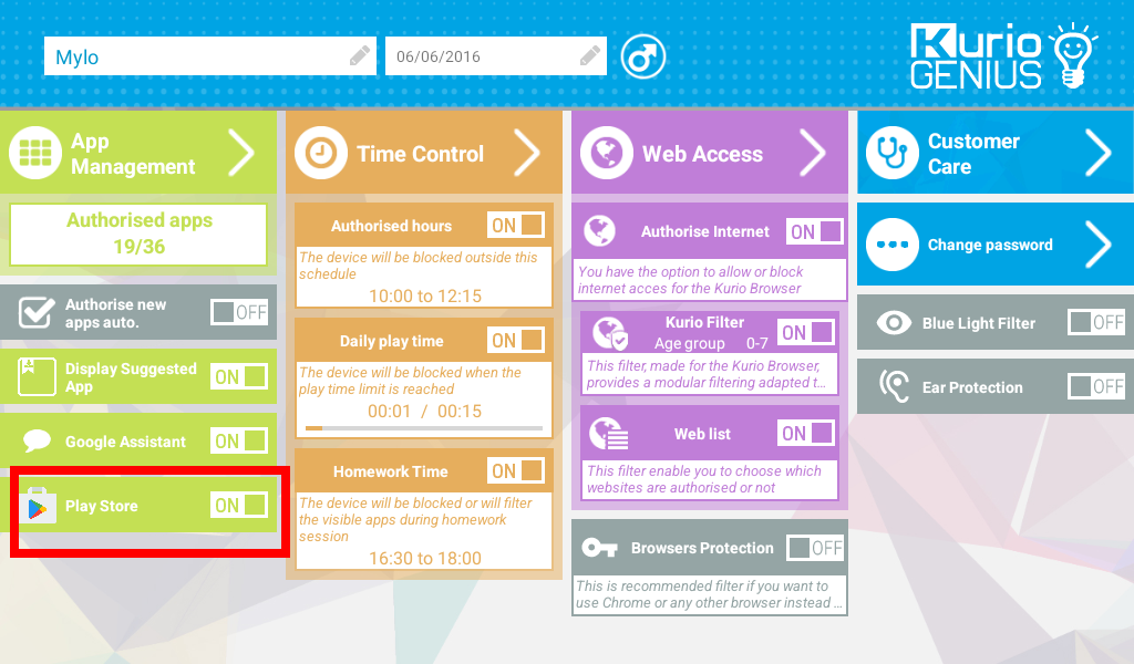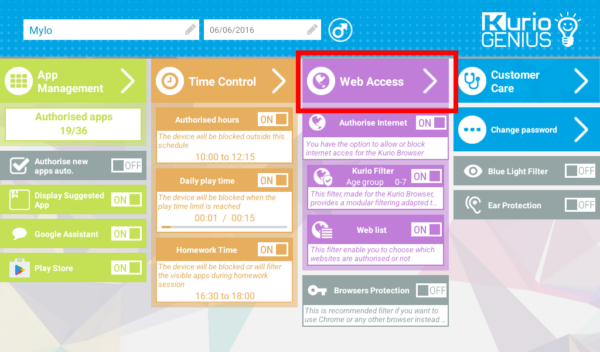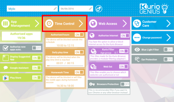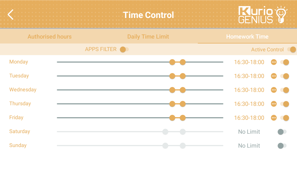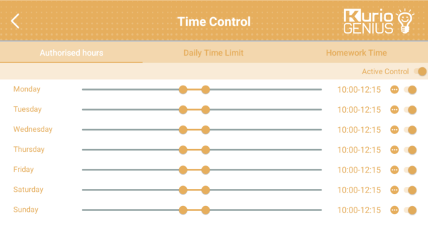 There can activate or inactivate this control, the tablet will be available for your child only during the authorized hours. To apply the same authorized hours for every day tap on the 3 little dots on the right of the screen.