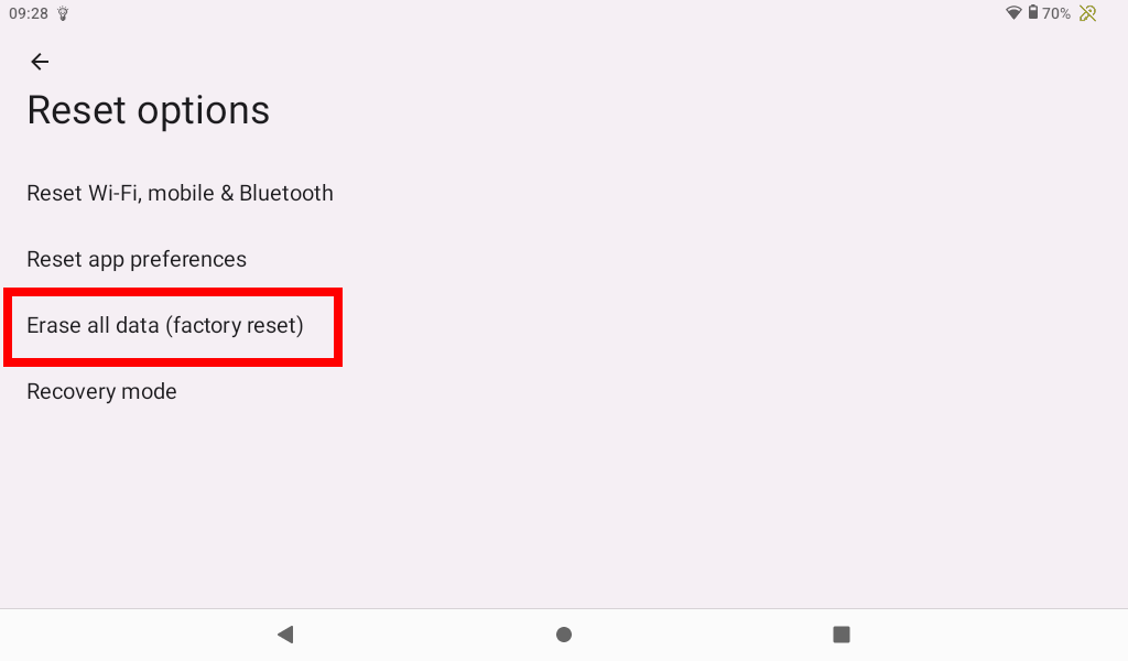 WARNING: a factory reset will erase all the content on the internal memory of your tablet, including all apps, games and files you save in this internal area. To keep your files, please move it to the external SD card first.